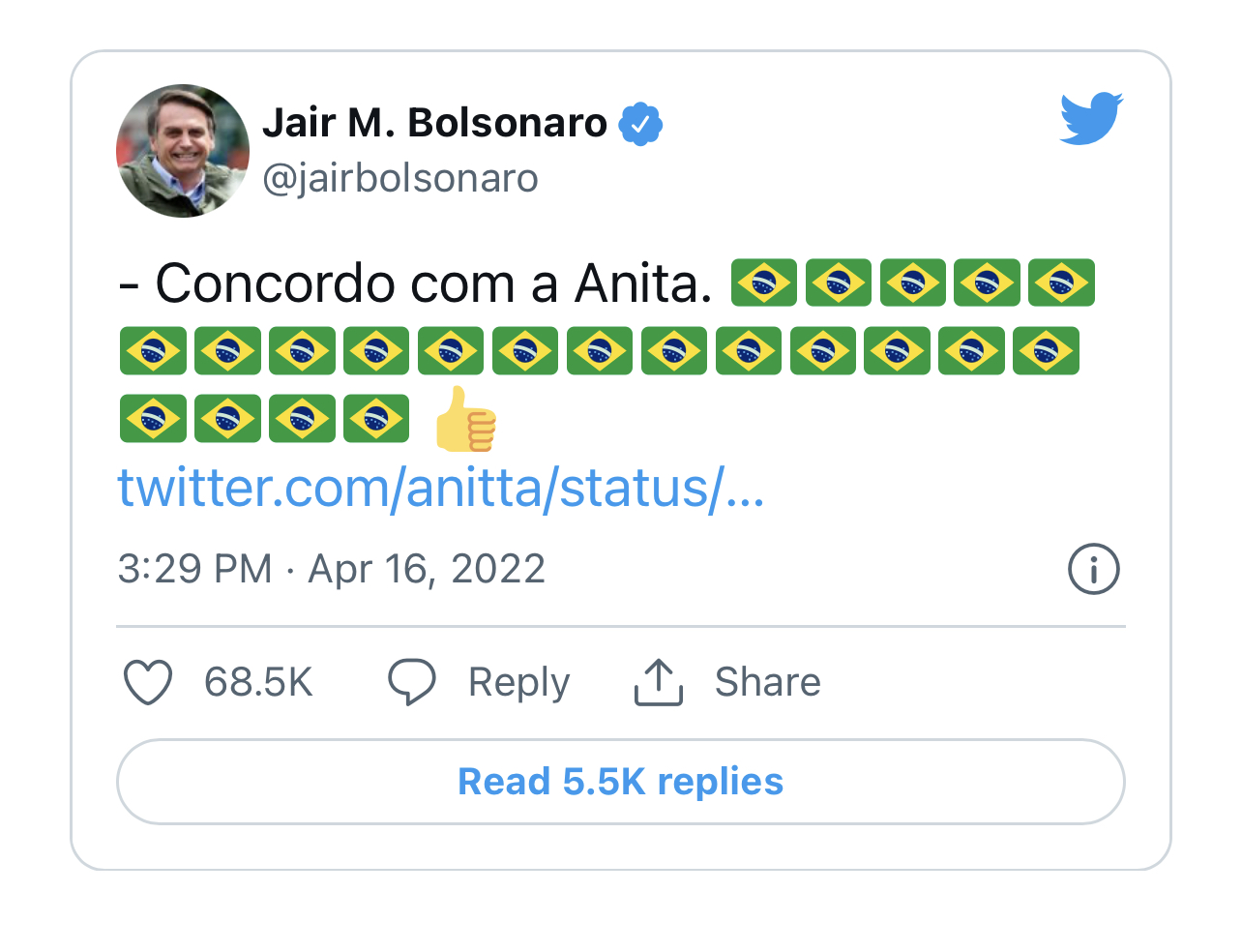Bolsonaro deu rt em um post em que Anitta refletia sobre a “apropriação da bandeira do Brasil” e ironizou o comentário da cantora: “Concordo com a Anitta”, escreveu junto de dezenas de emojis da bandeira brasileira.