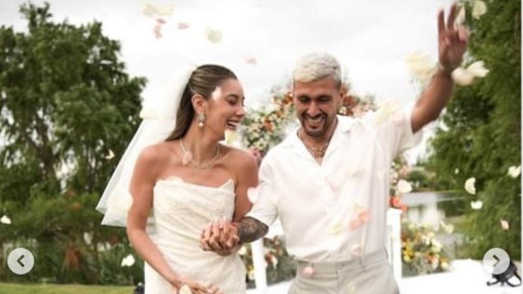 O craque do Flamengo Arrascaeta, de 29 anos, se casou no civil com Camila Bastiani, nessa terça-feira (19), com uma cerimônia ao ar livre, no Uruguai. A modelo uruguaia usou um vestido de noiva de renda, véu e joias, enquanto o jogador de futebol usou uma calça bege, camisa branca e tênis.
