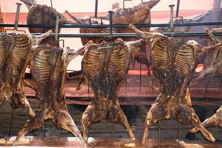 O assado do cordeiro segue a tradição do modelo uruguaio. As carcaças são espetadas inteiras e dispostas em pé, ao redor de um fogo de chão, e vão assando levemente desde às 6h da manhã. Quando chega o meio-dia o churrasco está no ponto perfeito.