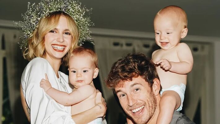 A chefe de cozinha e o marido recriaram o cenário de duas imagens já registradas anteriormente, a primeira antes de serem pais, a segunda com os gêmeos Bento e Mel recém-nascidos.